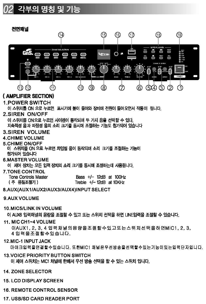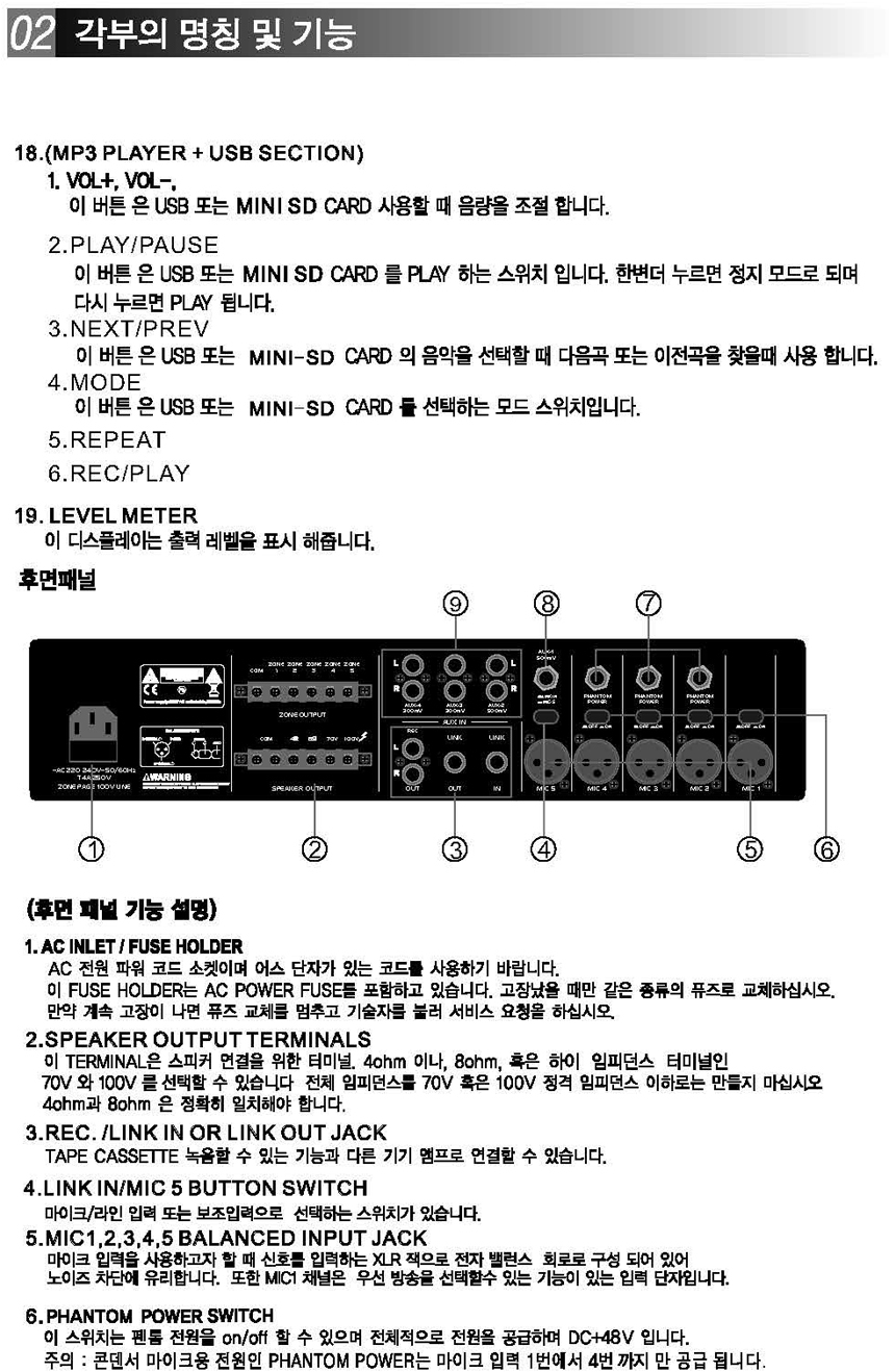 6개의 입력채널 볼륨 컨트롤과 2개의 팬텀전원 및 마이크 우선방송 기능과 5개의 스피커 지역 선택이 가능하며,