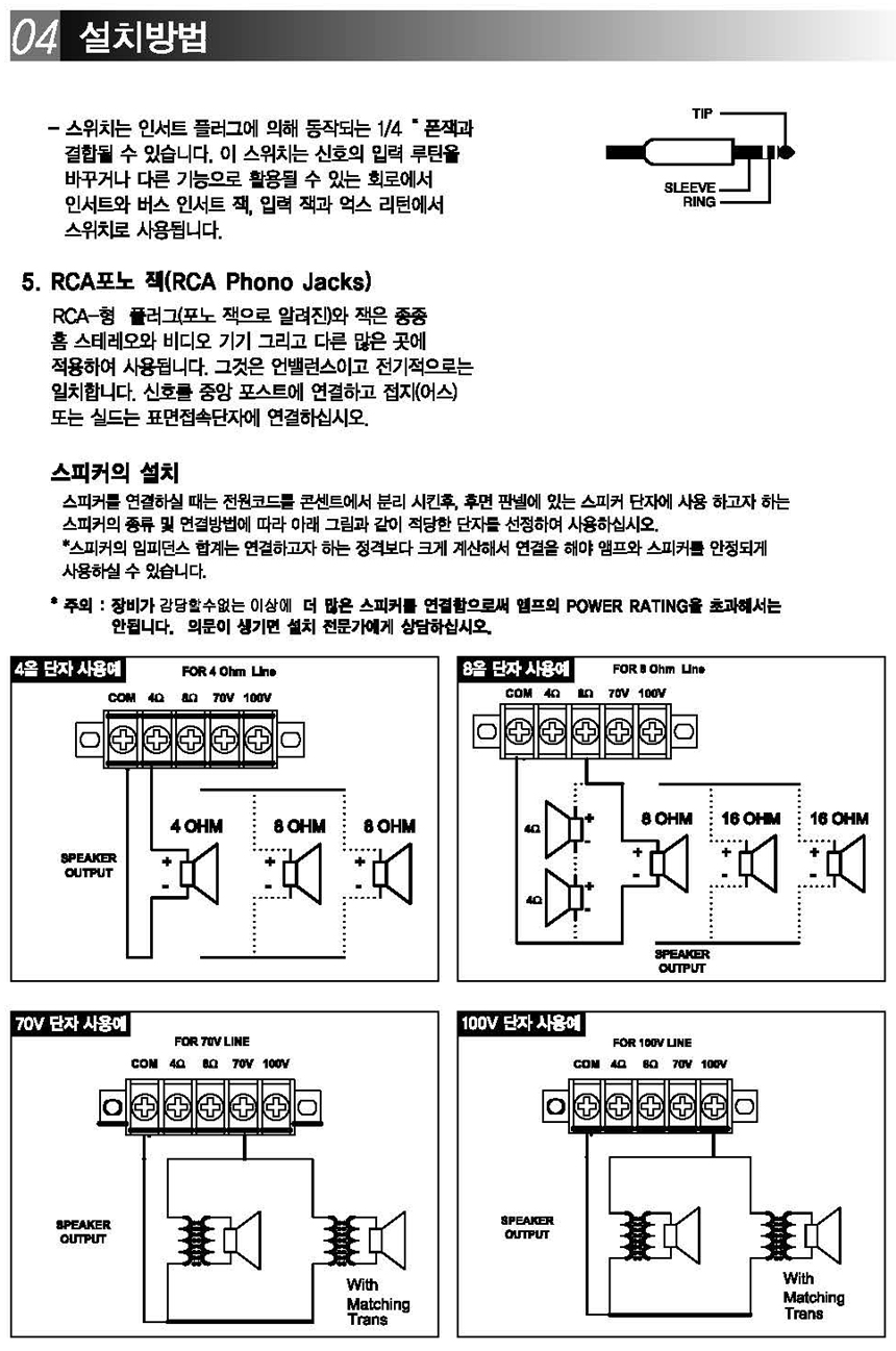 스피커출력/임피던스 : 100V, 70V, 4Ω, 8Ω
