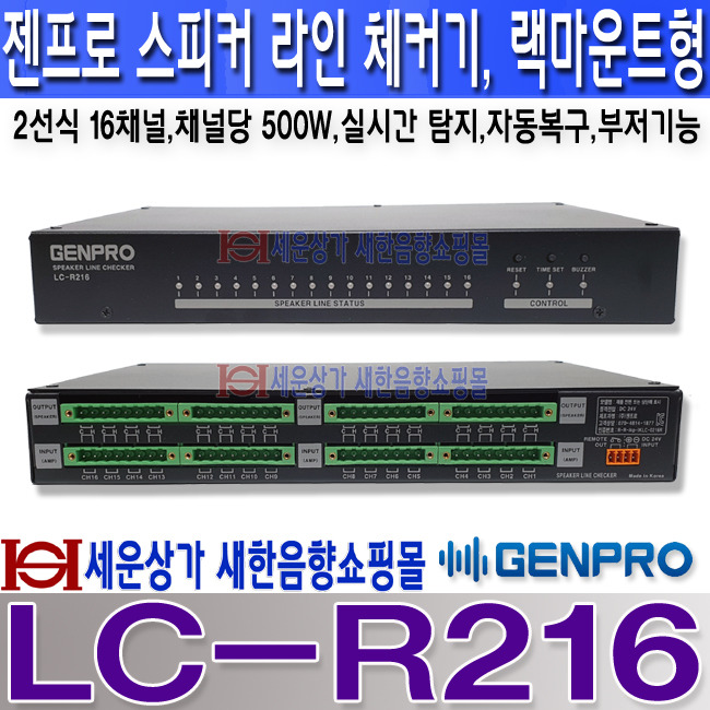 LC-R216, 젠프로(GENPRO) 랙마운트형 스피커 라인체커기,채널당 500W 16회로, 2선식 연결, 실시간 탐지,자동복구,부저기능.LCR216 본문