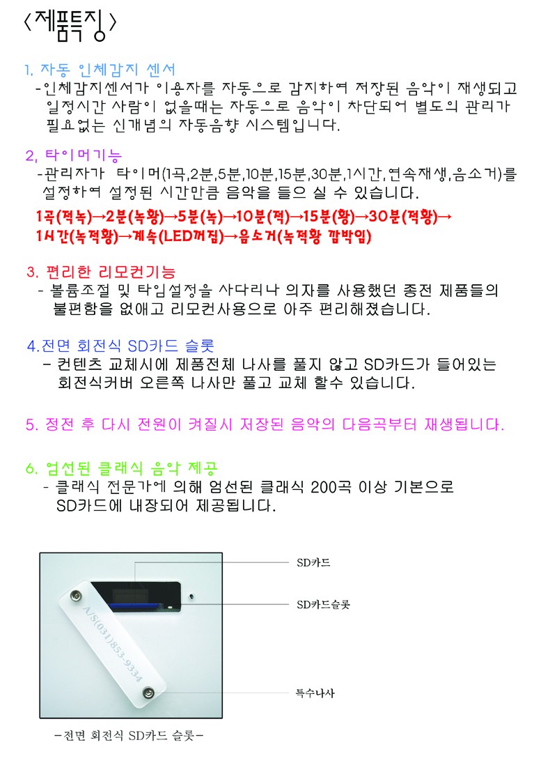 리모콘 기능형, 고전 클래식 200여곡 음원 내장, SD카드 손쉬운 음원 교체 가능