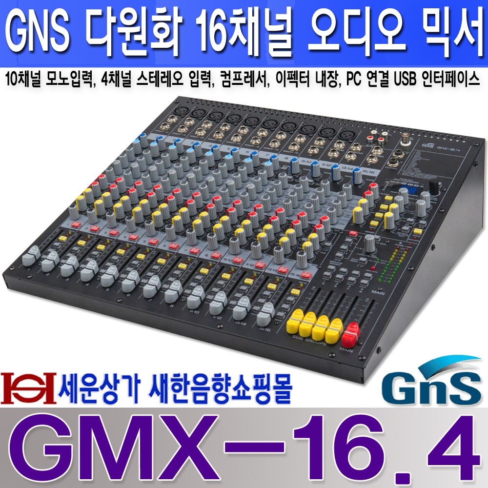 GMX-16.2 지앤에스 16채널 오디오믹서, 컴프레서, 이펙터 내장, 랙 브라켓 포함, 48V 팬텀파워지원, USB 인터페이스 기능.8채널 모노 입력, 4채널 스테레오 입력, 다양한 입출력.GMX162