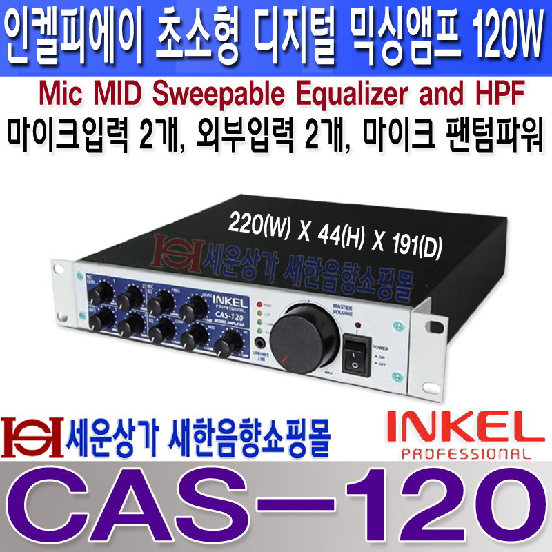 CAS-120, 인켈피에이 초소형 디지털 믹싱앰프 120W, 4오옴 단자,마이크 팬텀 파워,하울링 방지 기능,외부입력,전자교탁,강의실,카페등 사용,CAS120