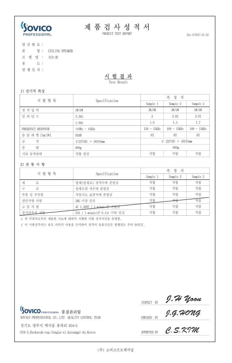- ICS-3E 실링스피커는 전 대역 스피커 UNIT 및 매칭트랜스 채용