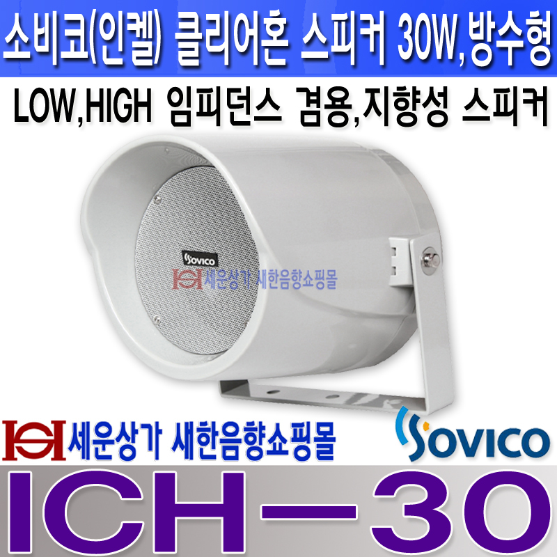 ICH-30, 소비코(SOVICO) 클리어혼 스피커 30W / 방수형으로 옥내, 옥외 설치가가능하며, 지향각 조절을 위한 상하 각도 조절 용이함.ICH30 지향성 스피커