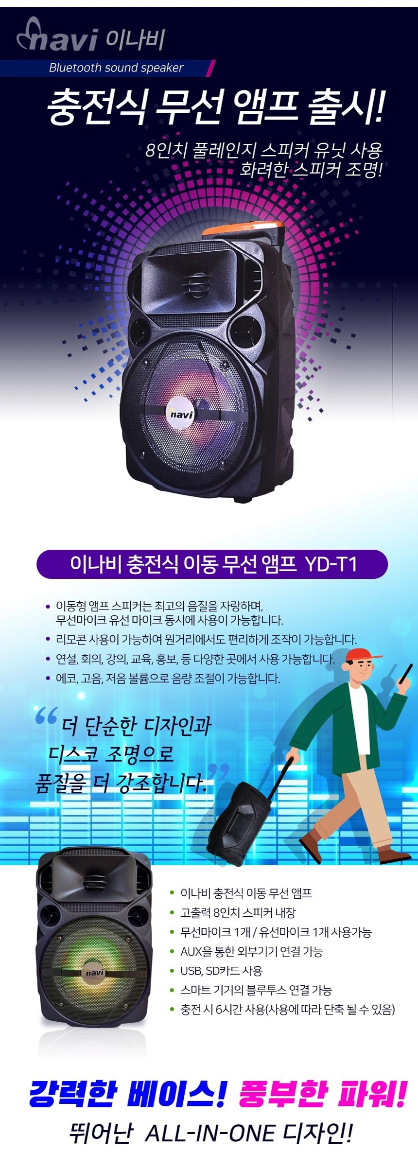 YD-T1 이나비 충전식앰프 P.M.P.O 200W, 무선마이크, USB, SD카드 사용, 블루투스, 마이크 에코, 녹음 재생 기능 내장, 8인치 우퍼 내장 2웨이 구성. 안전 교육, 야외 행사, 실내 교육, 버스킹, 악기 연주.. 본문