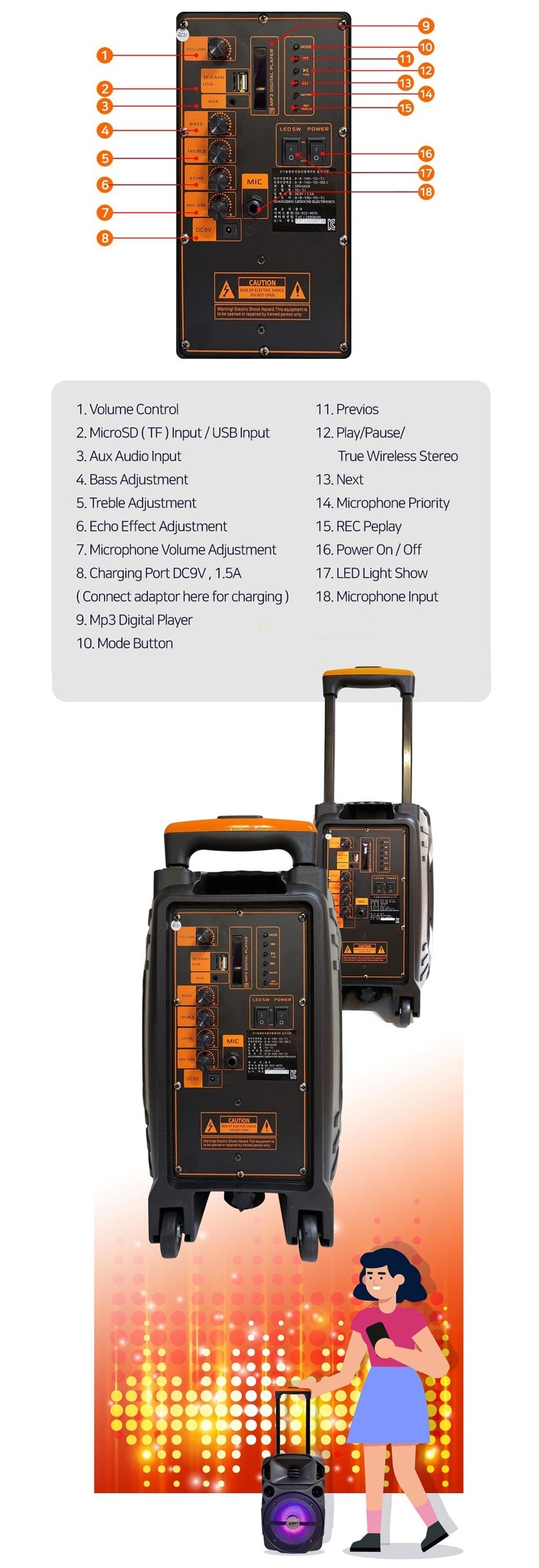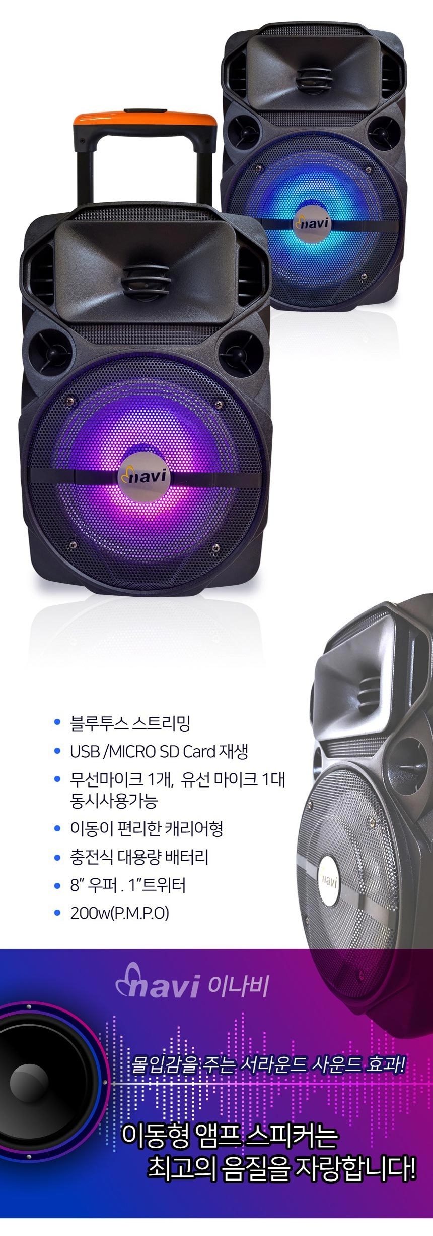 8인치 우퍼 내장, 캐리어 방식, 1채널 무선마이크 포함