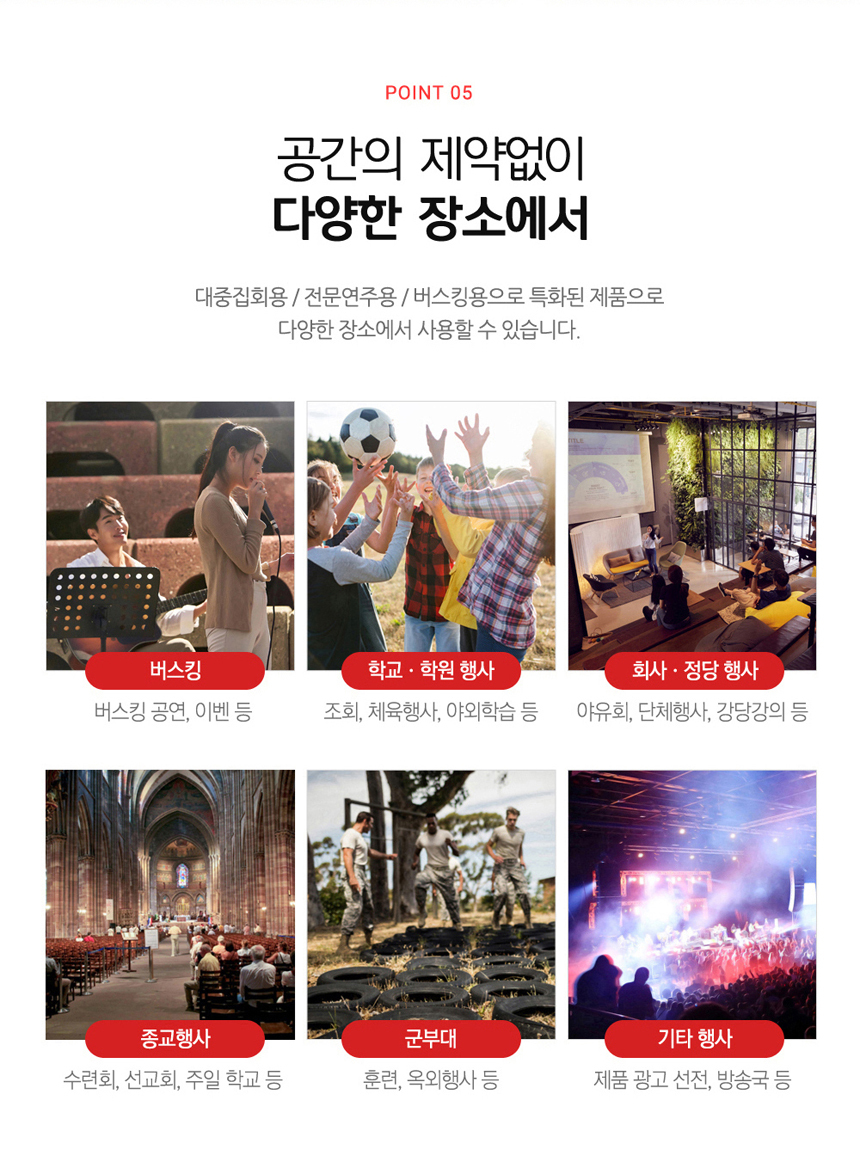 선거유세, 집회, 버스킹, 강당, 학교, 교회, 전시장, 모델하우스, 법당, 군부대등 사용
