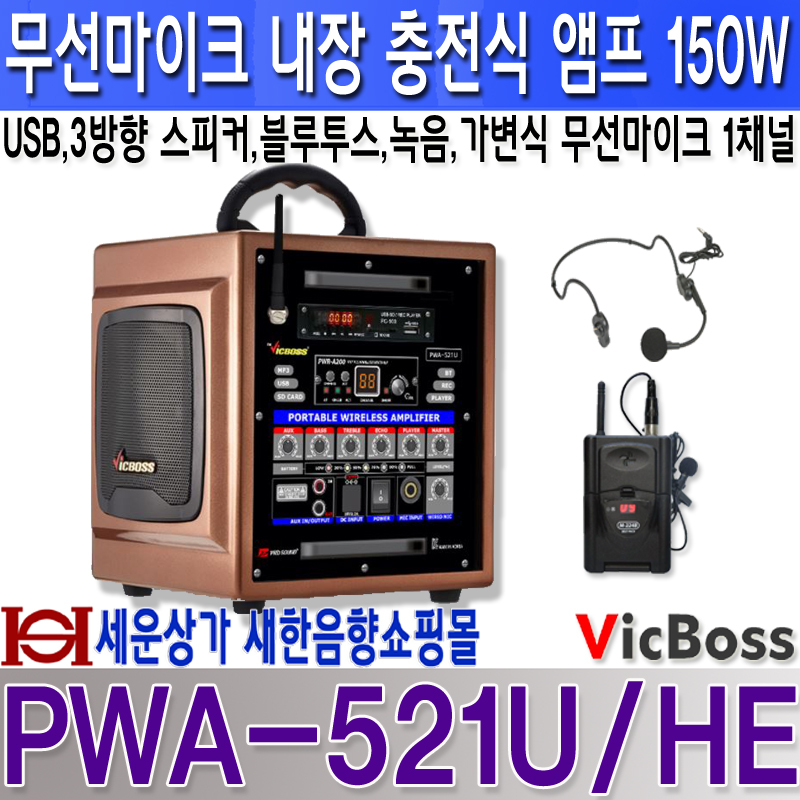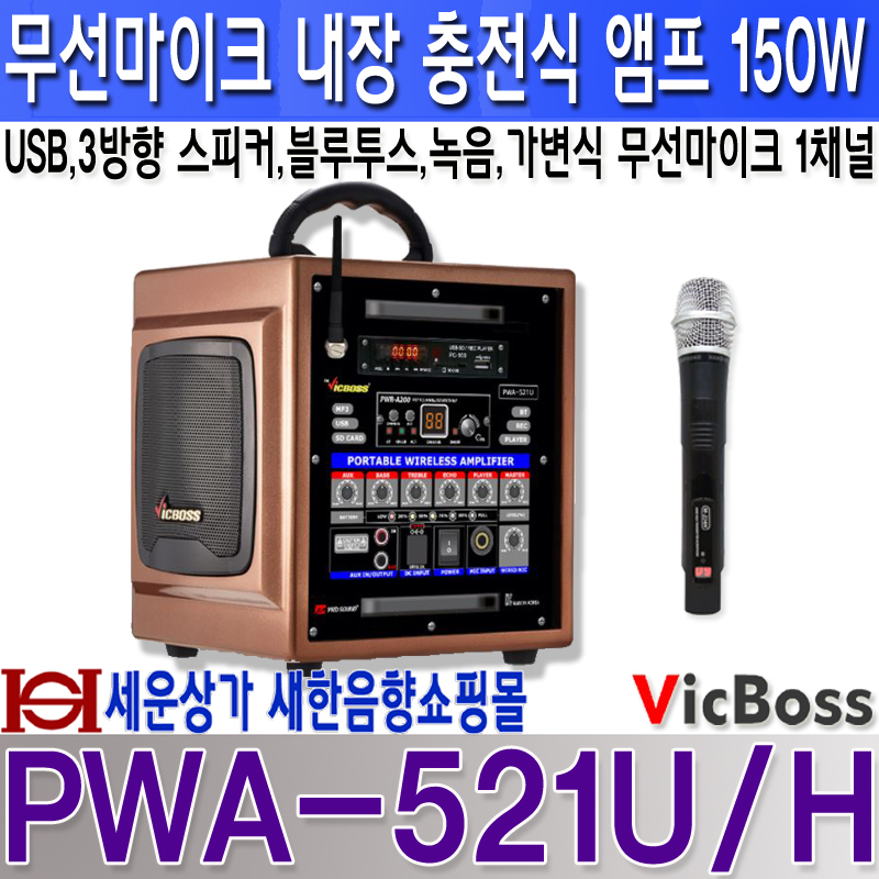VICBOSS PWA-521U 150W 충전용앰프,USB,SD,블루투스,녹음,1채널 200MHz 가변식무선마이크,3방향 스피커,PWA521U