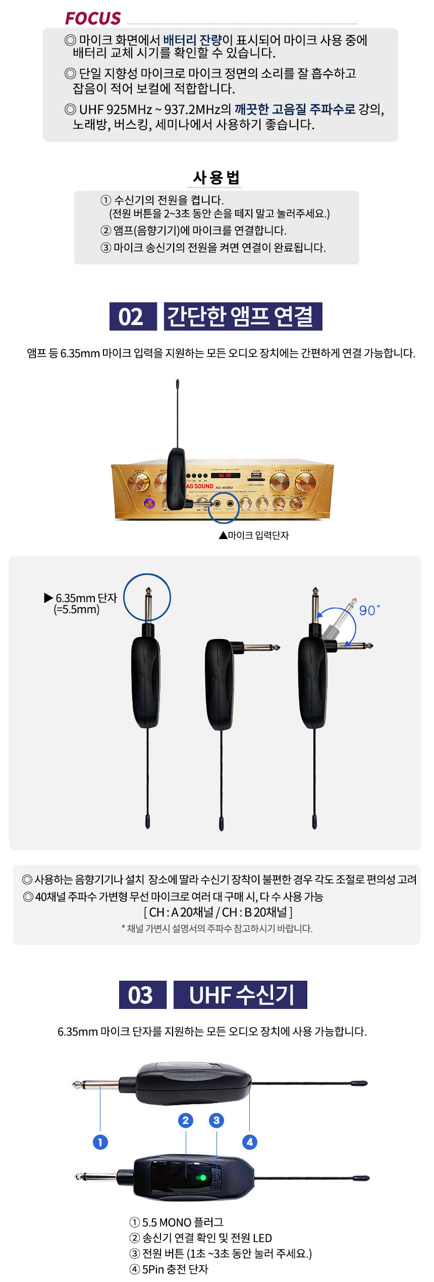 * 제품의 특징 및 사양 ( AG-900 2채널 900MHz 무선마이크 )