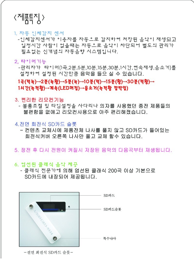 고전 클래식 200여곡 음원 내장, 내장 SD카드 MP3 파일 손쉬운 음원 교체 가능