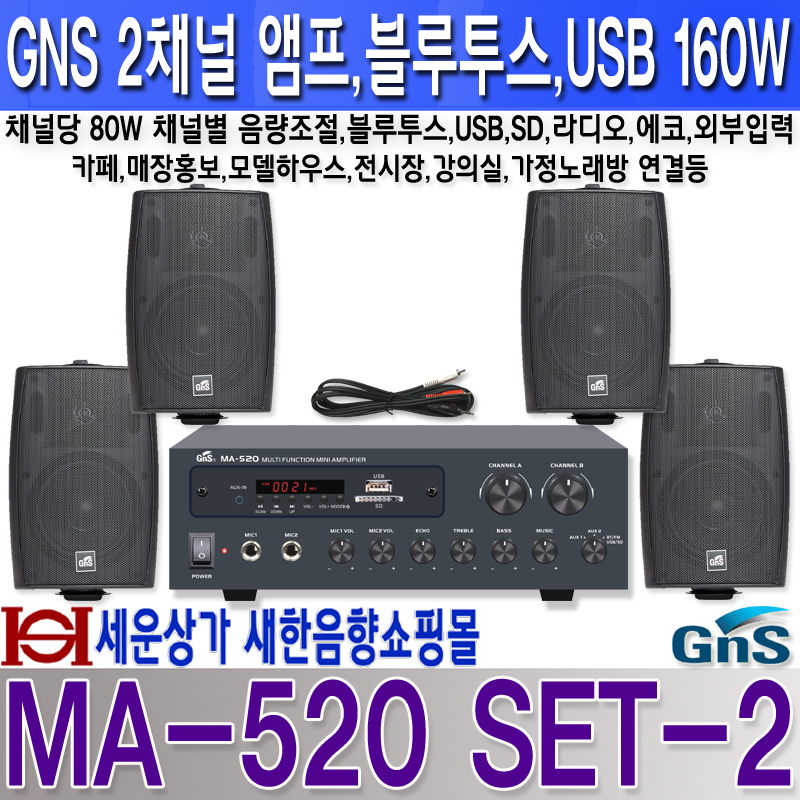 MA-520 SET-2 지앤에스 2채널 미니 앰프, 생활 방수 스피커 세트,USB, 블루투스, 라디오 기능, 2채널 스테레오 앰프, 채널별 개별 음량 조절.미니 앰프 + 스피커 4개 세트. 본문
