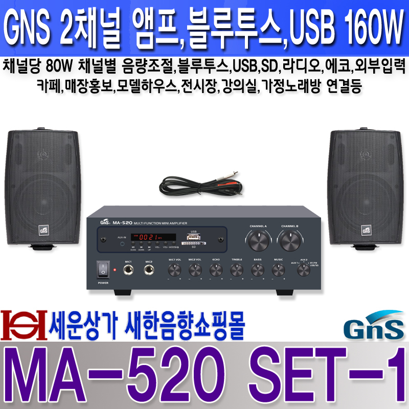 MA-520 SET-1 지앤에스 2채널 미니 앰프, 생활 방수 스피커 세트,USB, 블루투스, 라디오 기능, 2채널 스테레오 앰프, 채널별 개별 음량 조절. 앰프+스피커 2개 세트. 본문