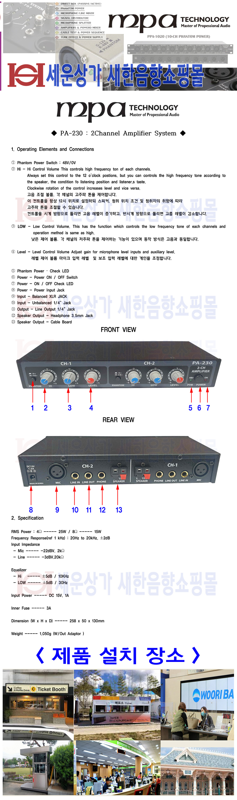 PA-230, 2채널 소형 앰프, 양방향 방송이 가능. 채널별 마이크 팬텀파워, 채널별 라인 입출력, 채널별 이어폰단자 내장.매표소,민원창구,상담창구.티켓부스등 사용. PA230