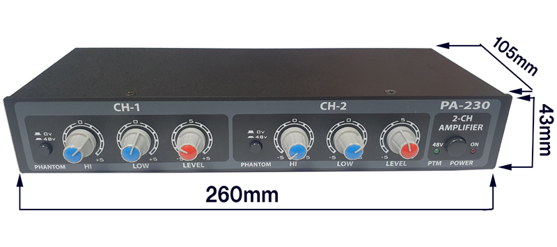 PA-230, 2채널 소형 앰프, 양방향 방송이 가능. 채널별 마이크 팬텀파워, 채널별 라인 입출력, 채널별 이어폰단자 내장.매표소,민원창구,상담창구.티켓부스등 사용. PA230 본문