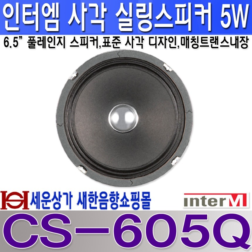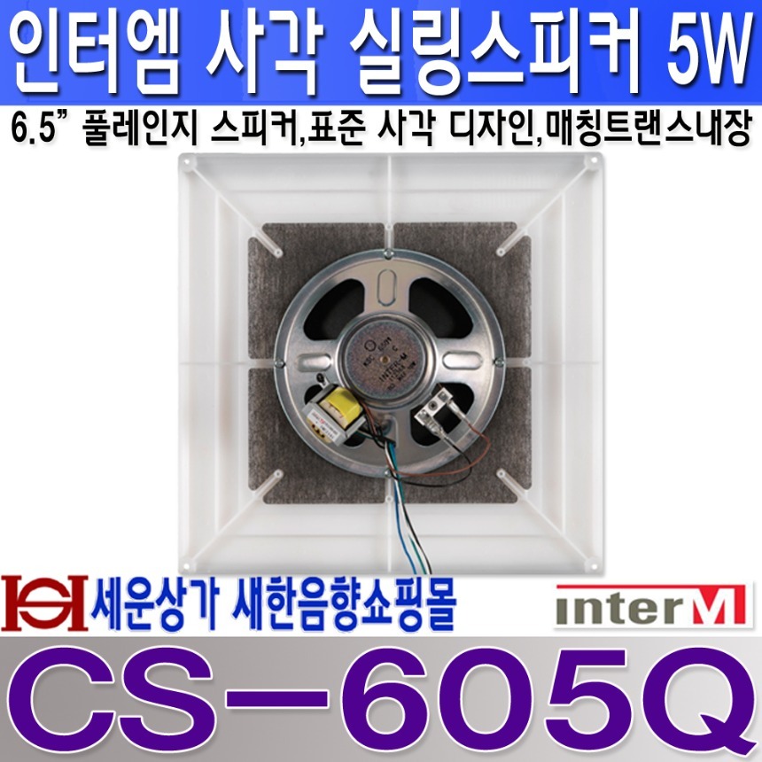 CS-605Q 인터엠 사각 실링 스피커 5W, PVC 재질의 전면 그릴 및 후면 커버 사용, 6.5 인치 풀레인지 스피커 채용, 텍스 형태의 천정에 손쉬운 설치. CS605Q 본문
