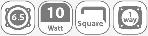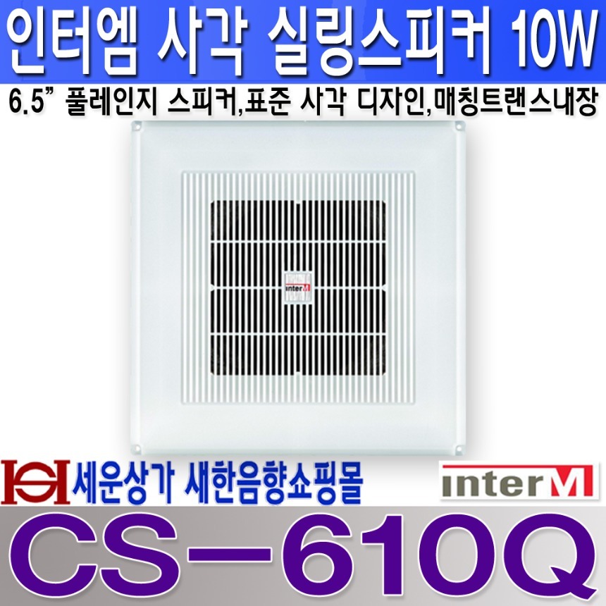 CS-610Q 인터엠 사각 실링 스피커 10W, PVC 재질의 전면 그릴 및 후면 커버 사용, 6.5 인치 풀레인지 스피커 채용, 텍스 형태의 천정에 손쉬운 설치. CS610Q