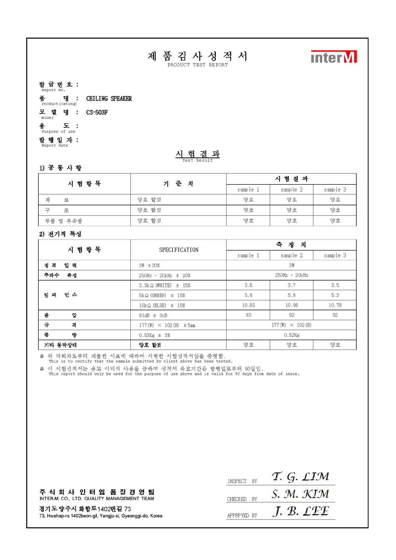 풍부한 저음 대역, 고품질 매칭트랜스 사용, CS-503F 인터엠 실링스피커