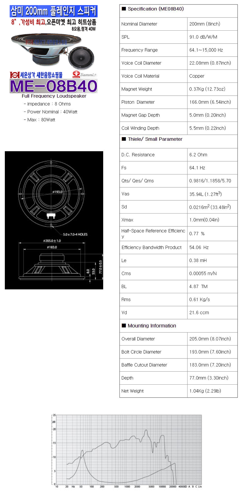 ME-08B40, 삼미스피커 8인치 풀레인지 스피커 정격 40W,8인치 풀레인 지스피커, ,ME08B40 본문