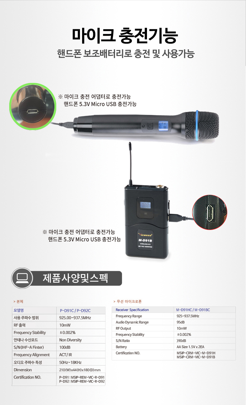 충전식 무선 핸드 마이크형 구성 1채널 / P-D91C
