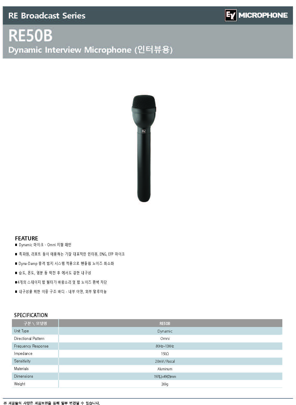 EV 유선마이크, RE50B 인터뷰, 특파원, 강의실, 학교 방송실, 스튜디오, 유투버, 설교용, Dynamic Interview Microphone, 스피치에 특성화된 음성 전달용 마이크.