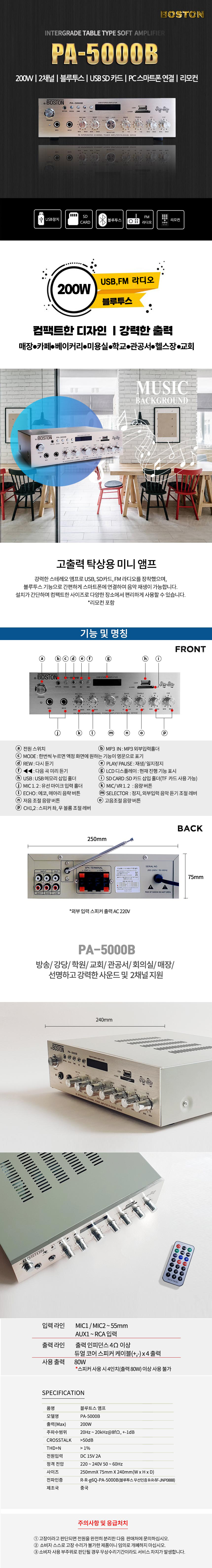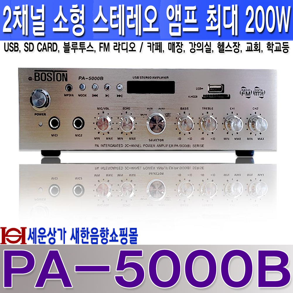 PA-5000B 소형 스테레오 2채널 앰프, USB, SD CARD, FM 라디오, 블루트스 기능, 최대 출력 200W, 카페, 매장, 회의실, 안전교육장, 헬스장, 미용실, 학교, 교회등 다용도 사용.PA5000B 본문