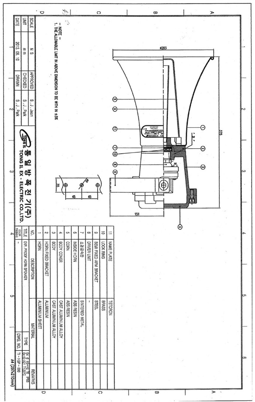 TI-BHSP방폭스피커 / 내압 방폭형 혼스피커 10W ~20W 선택폭발성가스가 존재하는 장소에서 사용되는 방폭스피커가스공장,발전소,화학공장등에서 주로 사용되는 방폭 혼스피커출력 10W 또는 20W 선택이 가능합니다.(금액 추가됨)하이임피던스, 앰프 저항값 70V 100V 스피커 단자에 연결 사용" MADE IN KOREA "