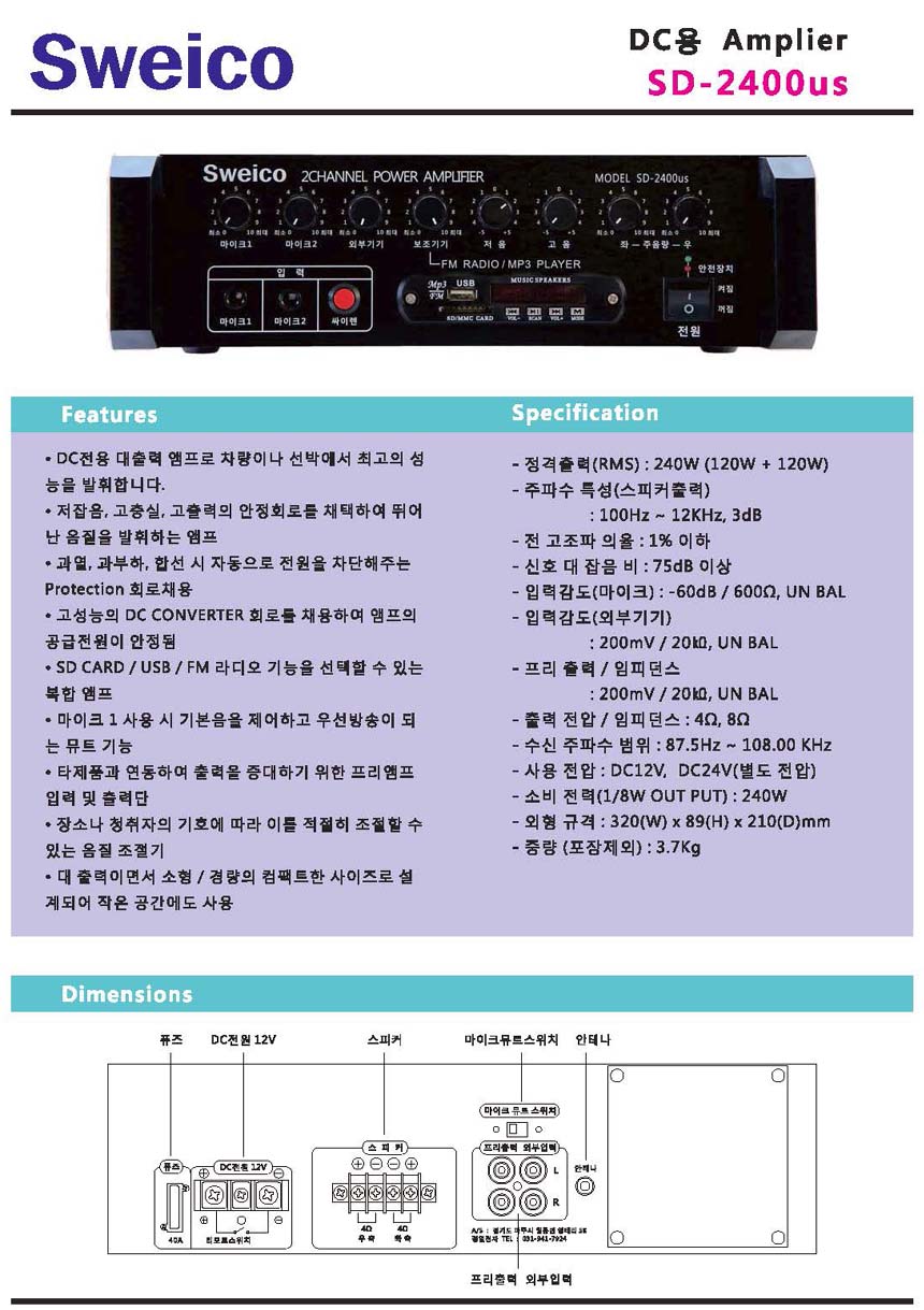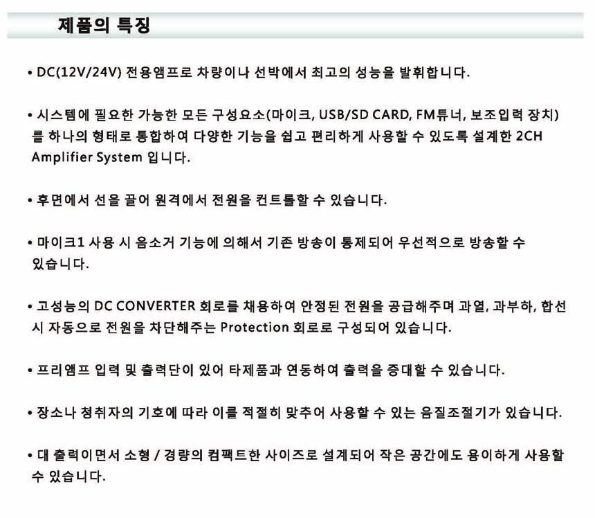 SD-2400US, 차량,중장비,선박앰프,D.C 전용,USB,SD,라디오,싸이렌,외부입력,라인출력,마이크입력기능,240W, 지아이트론 앰프 본문