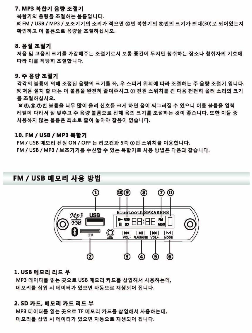 - SD CARD / USB / FM 라디오 기능을 선택 할 수 있는 복합 앰프