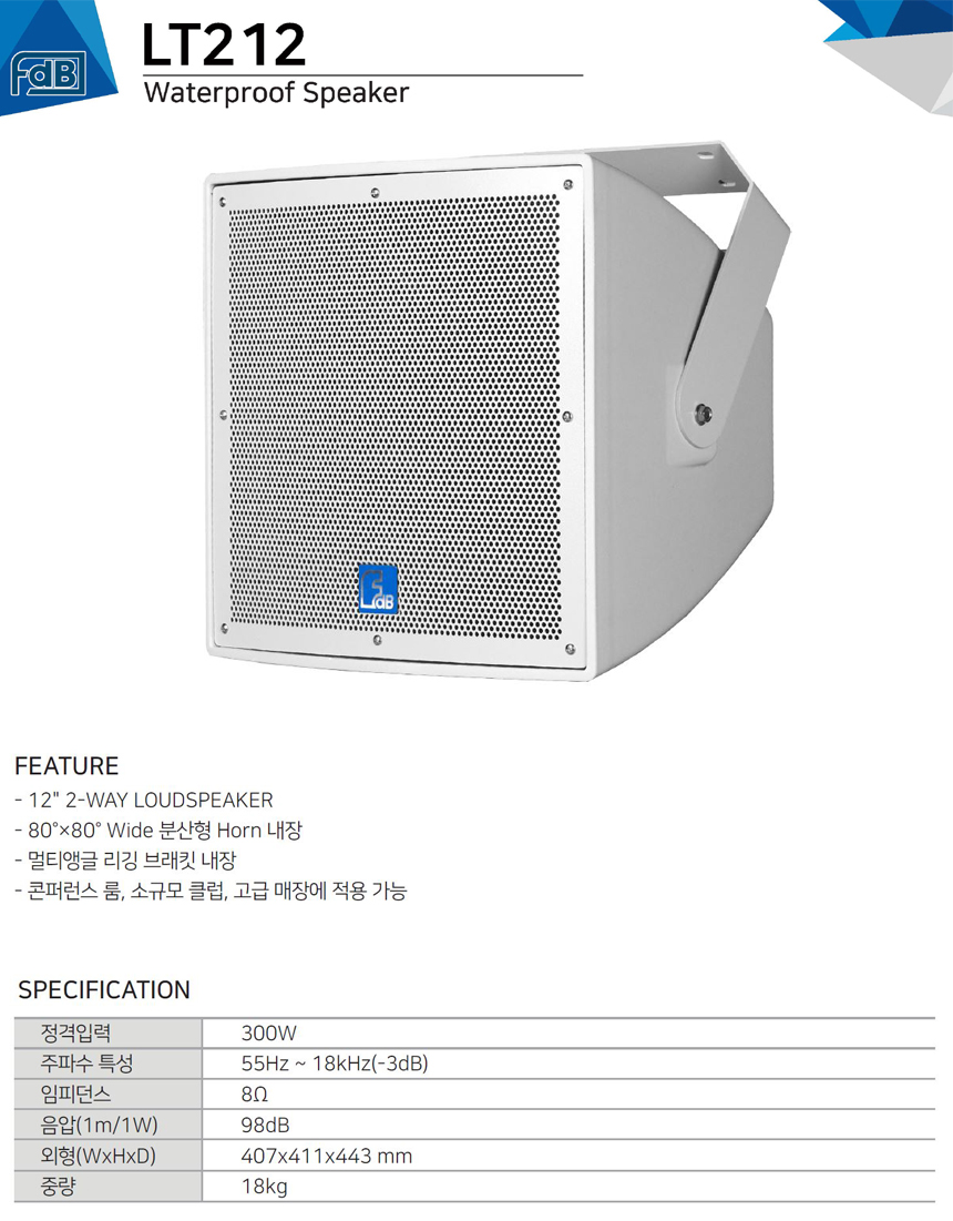 LT212T FDB 12인치 2웨이 방수, 방진 스피커, IP56 등급, 정격 300W, 최대 1200W, 넓은 장소 사용 적합, 스포츠 경기장, 워터파크, 놀이공원, 유원지, 체육관등, 임피던스 하이 임피던스 전용. 본문