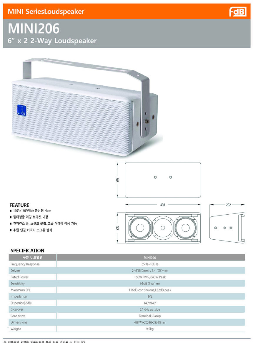 - FDB MINI206 은 140°×140°Wide 분산형 Horn을 내장한