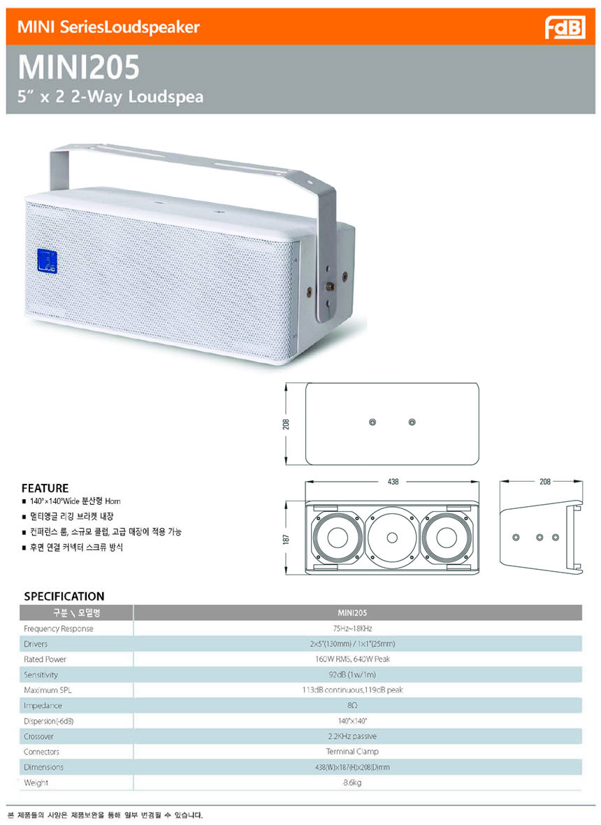 - FDB MINI205 은 140°×140°Wide 분산형 Horn을 내장한