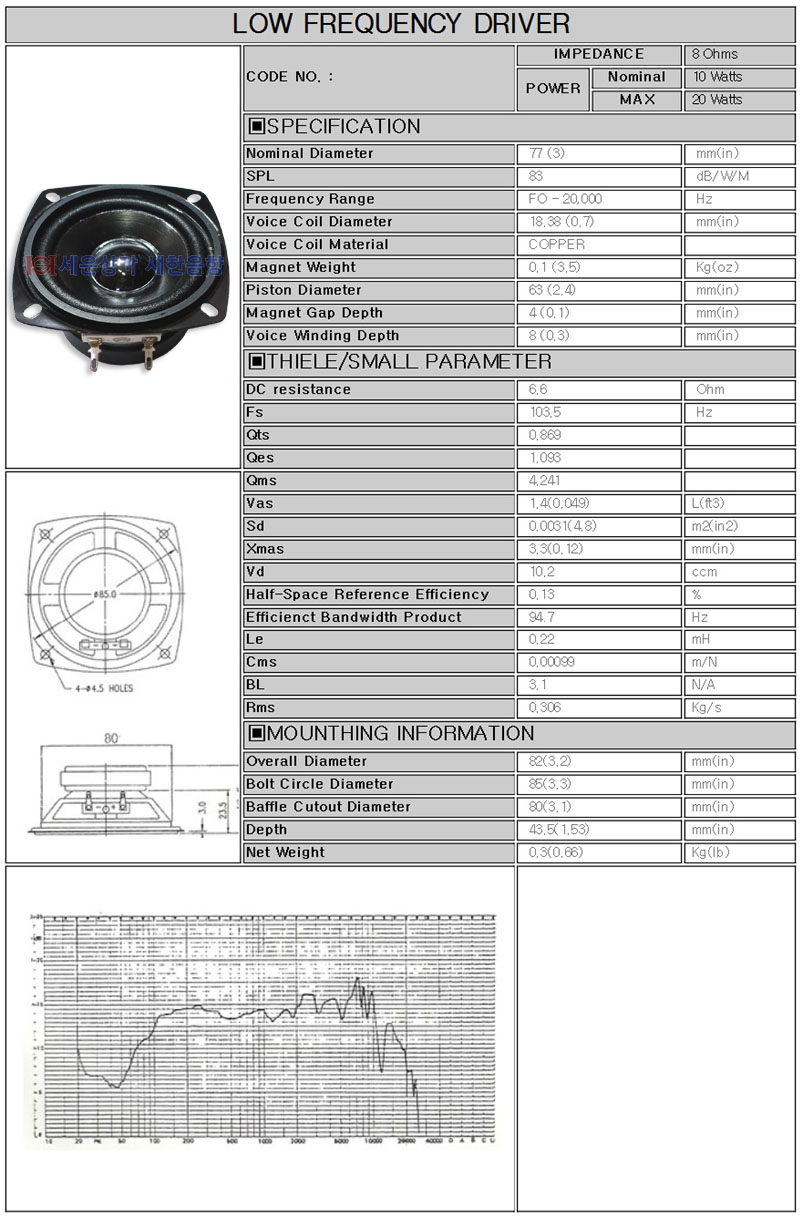 * 제품의 특징 및 사양 ( 삼미스피커 CW-77B10K / 3인치 풀레인지 스피커 )