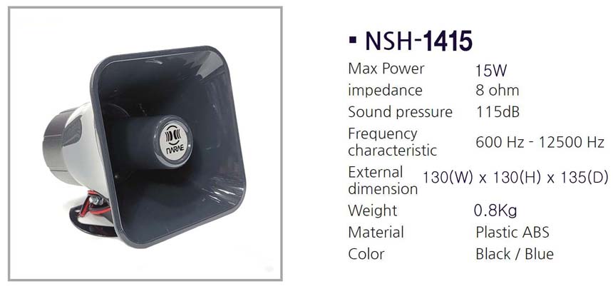 NSH-1415 소방 방수혼 스피커 15W, CCTV,중장비, 바이크, 차량, 인터폰 음성 보강 및 경보기 음성 전달용, 기타 산업 기자재등 다용도 사용 본문