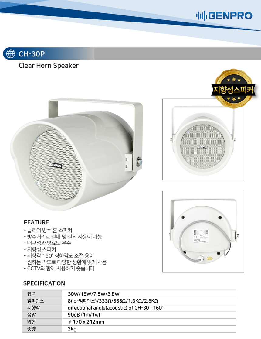 CH-30P 젠프로 클리어 혼 스피커 30W, 방수 스피커, 지향성 스피커, 공원, 지하철, CCTV 경고 방송, 매장, 카페, 팬션, 가로등, 전시장, 지하철 등 다용도 사용.CH30P 본문