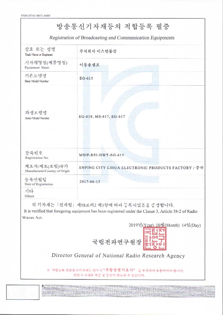 - 방송 통신 지자재 적합 인증 번호 : MSIP-REI-HWT-EG-615 / MSIP-CRI-HWT-HT-600 / MSIP-CRI-HWT-PT-600