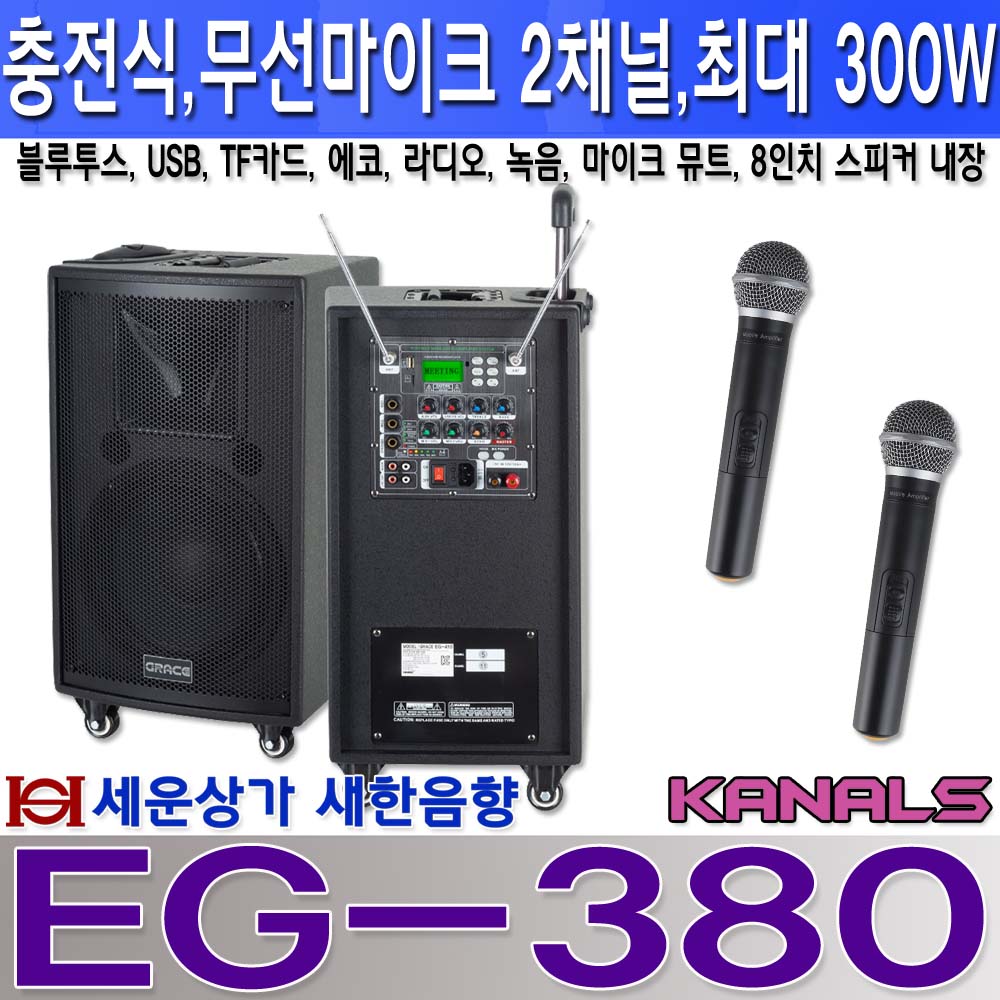 EG-380 카날스 충전식 앰프 300W, 2채널 무선마이크, 블루투스, USB, TF CARD, 라디오, 에코, 녹음, 뮤트 / EG380 / 버스킹, 안전 교육, 전시장, 실내 외 행사, 강당, 교회, 체육관, 휘트니스, 헬스장 등
