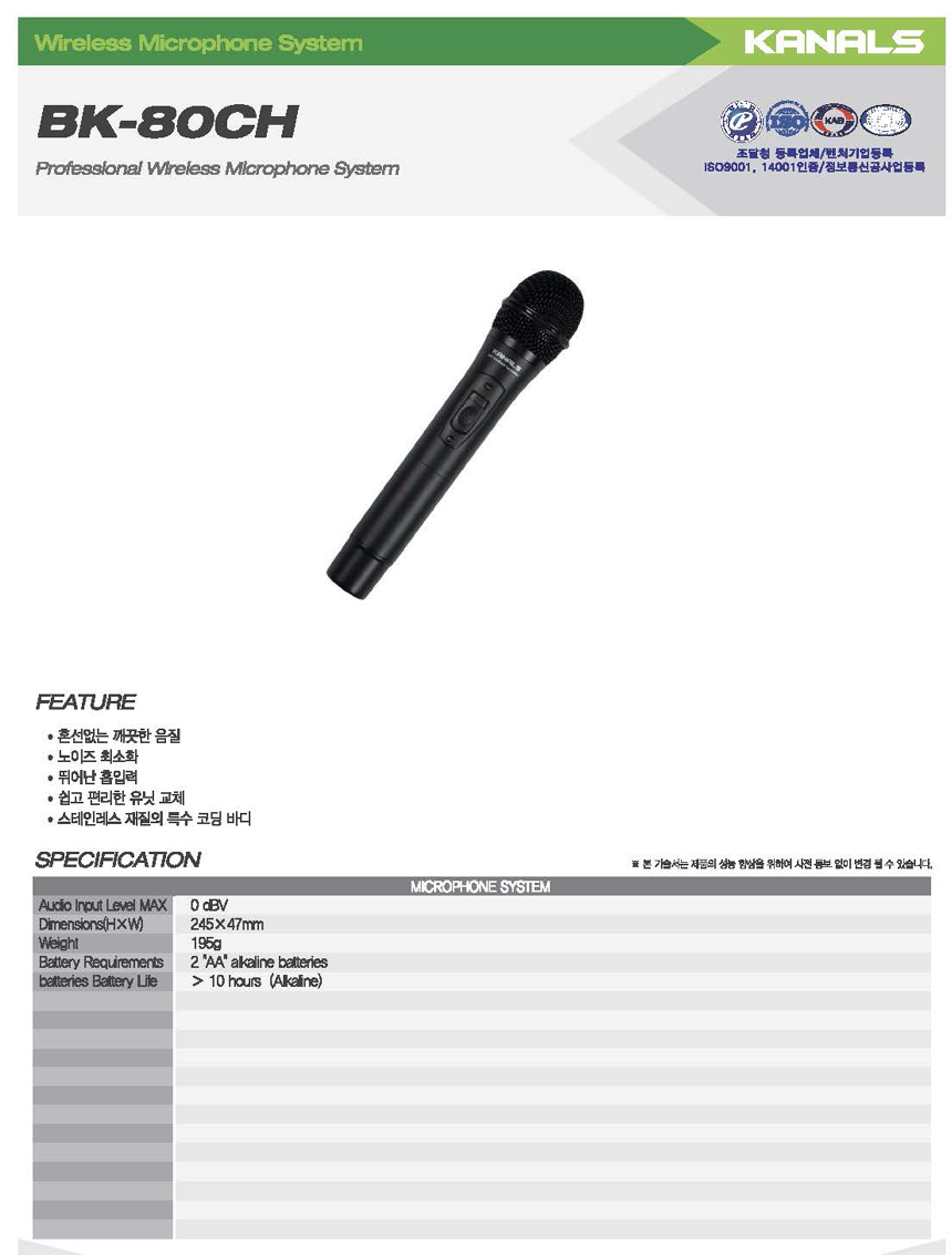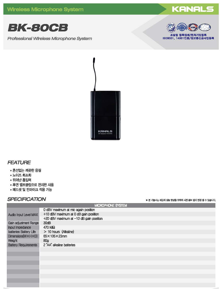 - 무선 마이크 송신기 모델명 : BK-80CH, BK-80CB