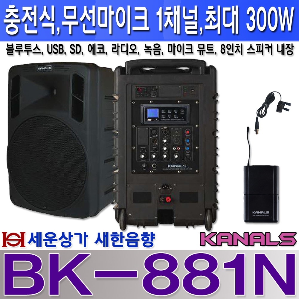 BK-881N카날스 충전식 앰프 300W, 1채널 무선 마이크,블루투스,USB,에코 녹음 : 세운상가 새한음향