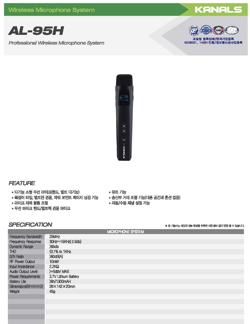 - 품 명 : 카날스 무선 마이크 내장형 충전 이동식 앰프 / AL007R