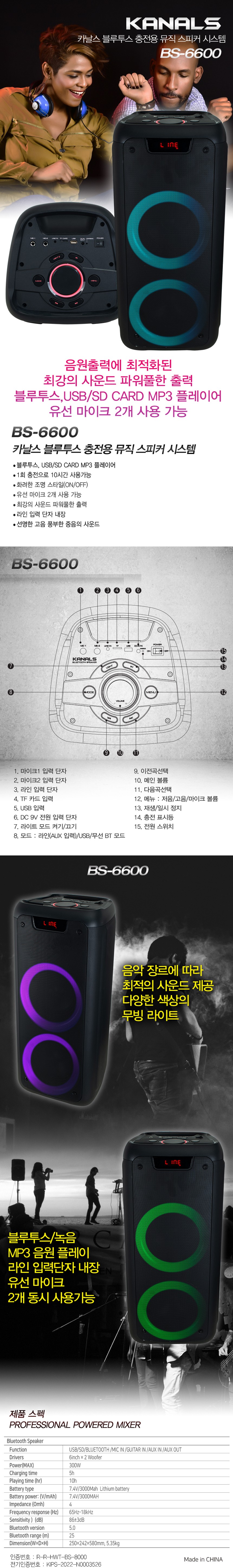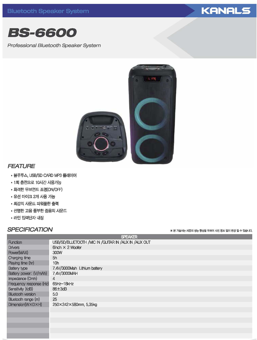 - 품 명 : 앰프 내장형 충전식 블루투스 스피커 300W / BS6600