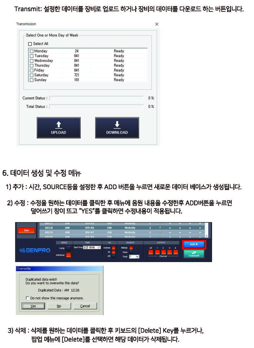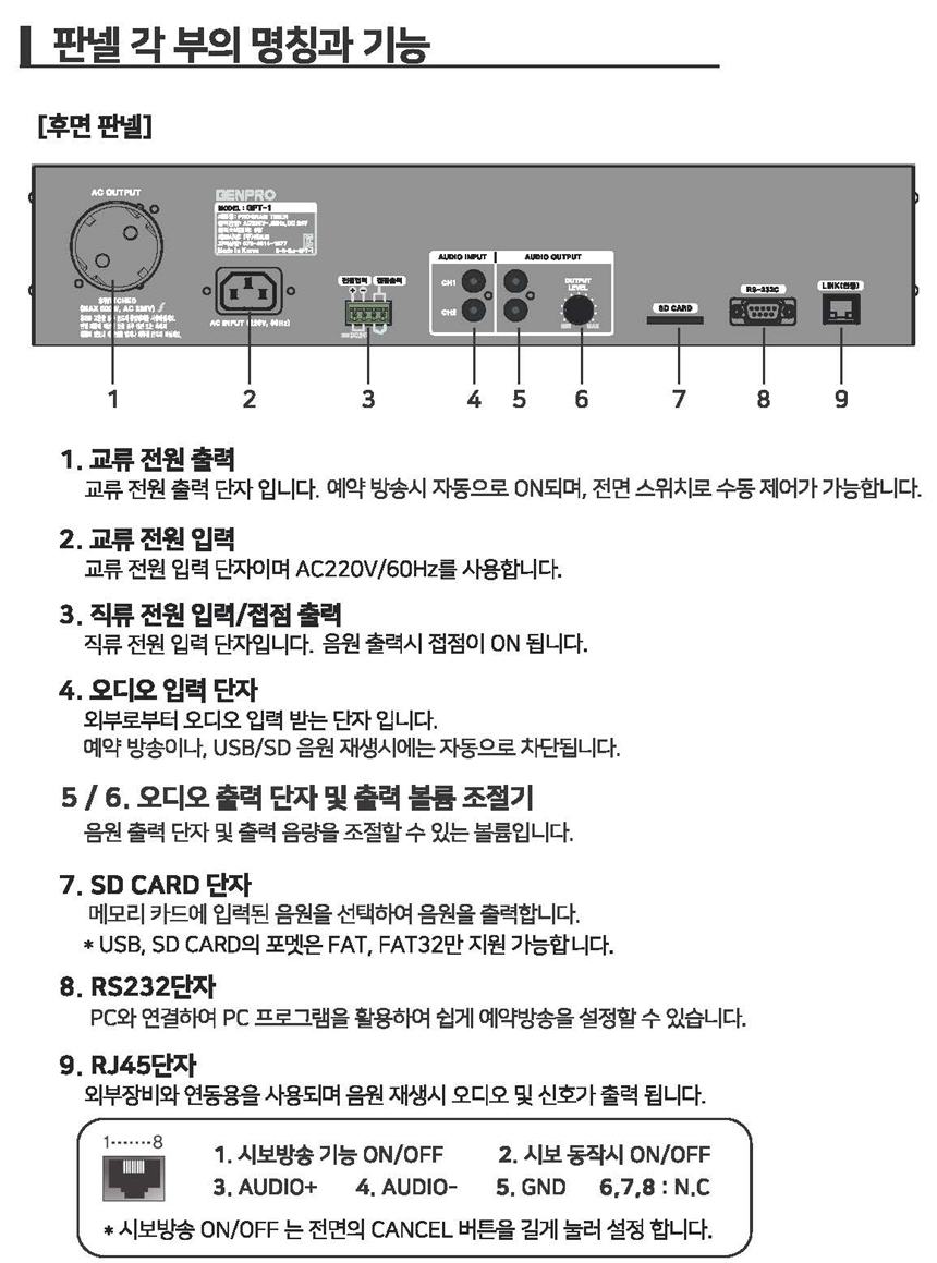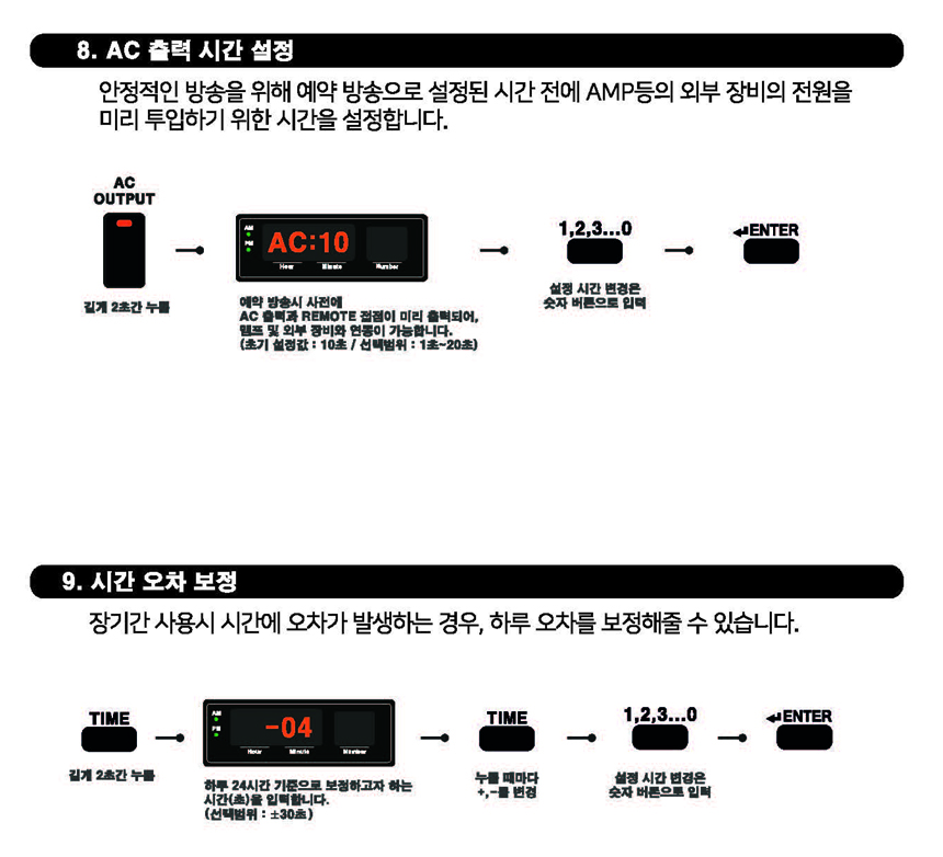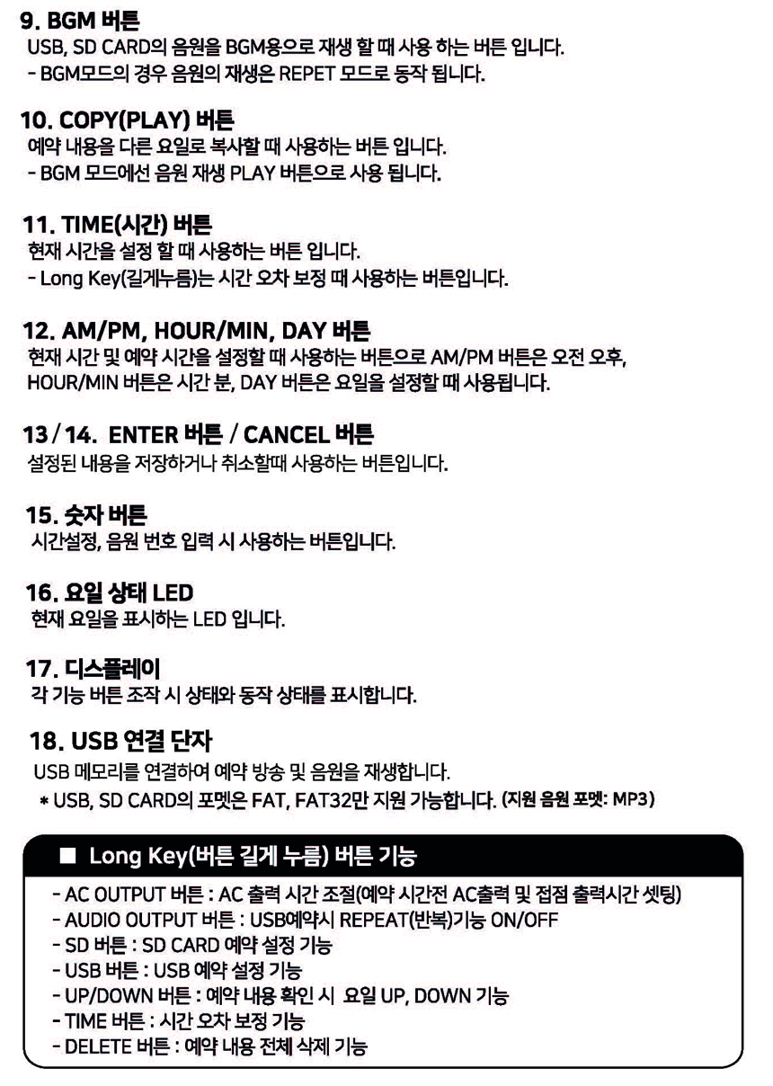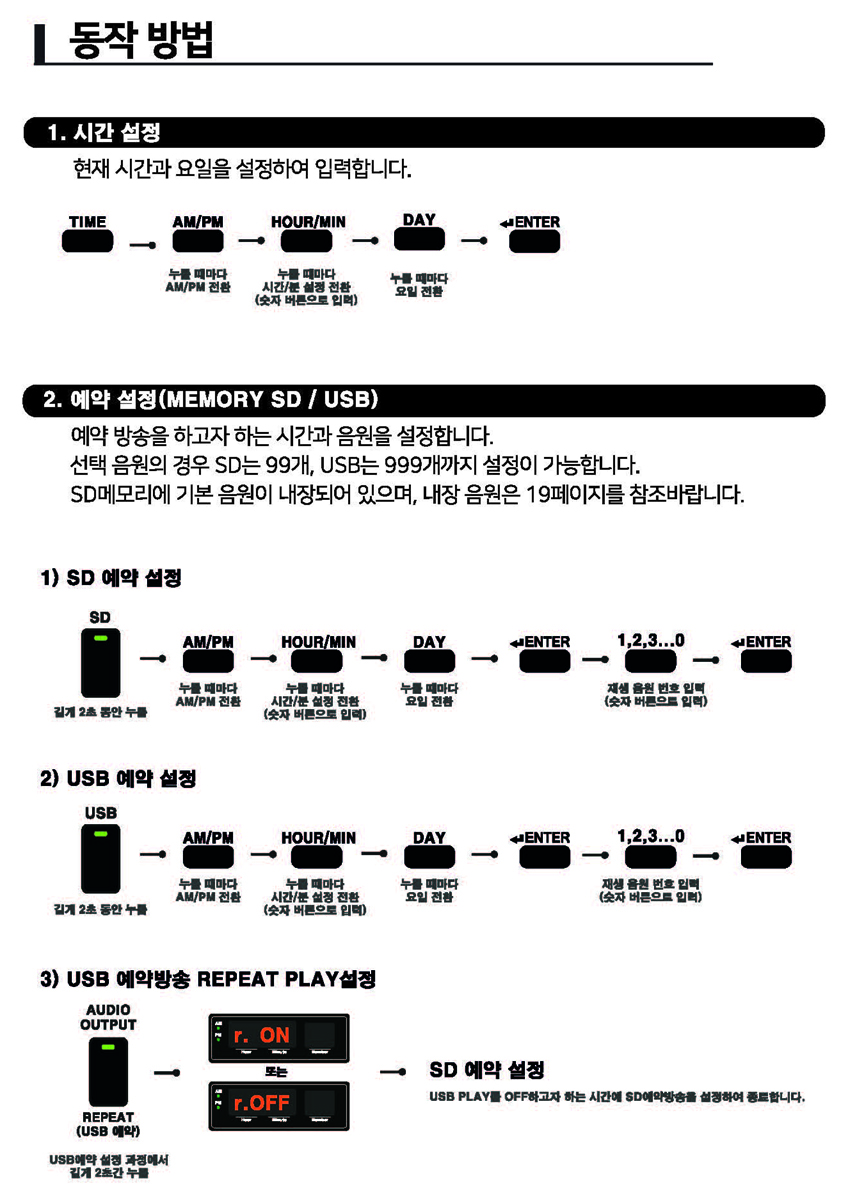 전면의 버튼 또는 PC와 연결하여 전용 프로그램을 통해 USB, SD CARD 음원 메모리 예약 방송 가능