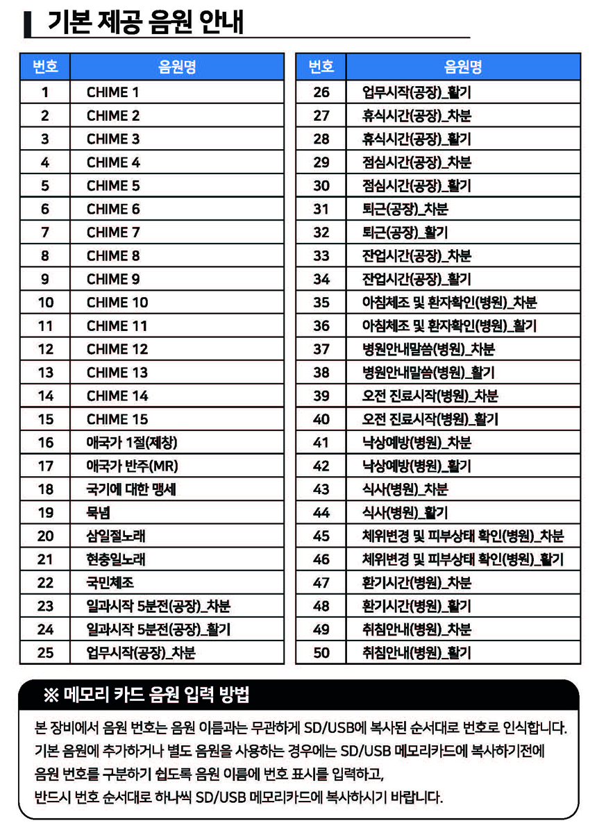 USB에 별도 음원을 저장하여 재생 및 예약 방송 가능