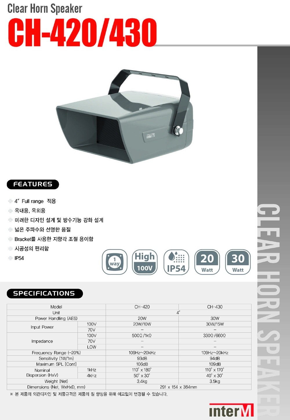 - 모델명 : CH-430 인터엠 클리어 혼 스피커 / 방수 혼 스피커