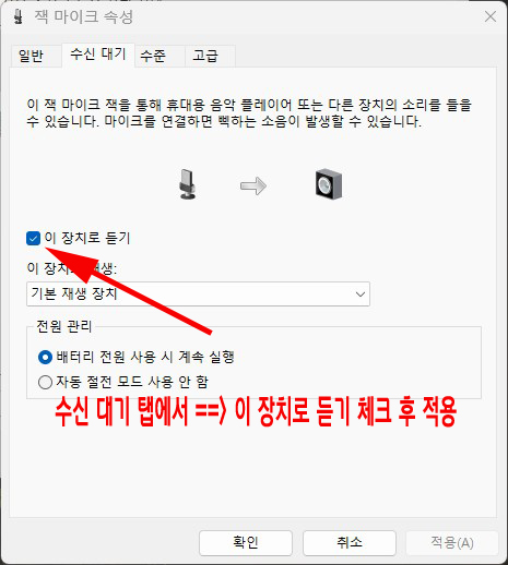 수신 대기 탭에서 ==> 이 장치로 듣기 체크후 적용 클릭