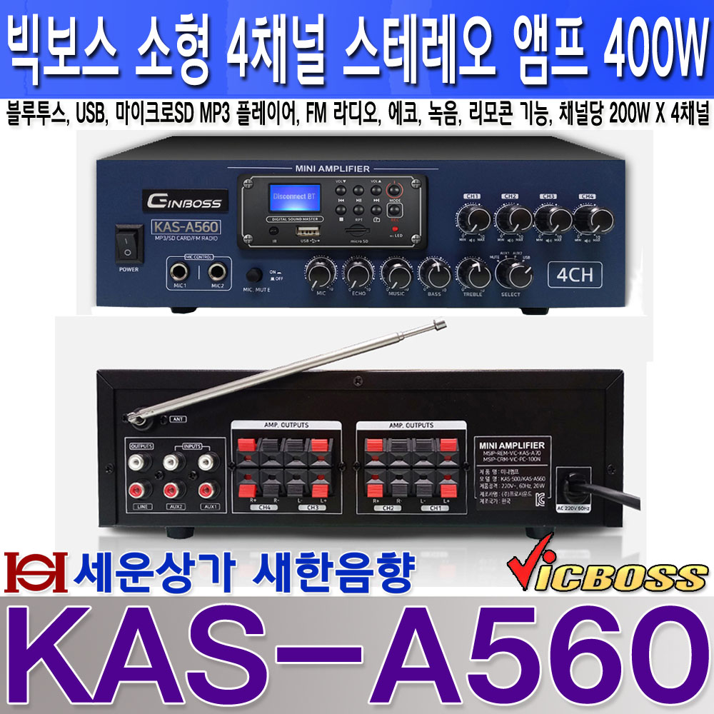 KAS-A560 빅보스 4채널 앰프 400W, USB 블루투스, TF 카드, 녹음, 에코, FM 라디오 기능, 라인 인 아웃 단자, 마이크 뮤트 기능, 마이크 입력 2개 / KASA560 본문