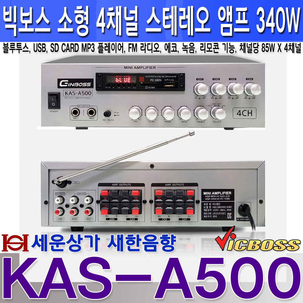 KAS-A500 빅보스 4채널 앰프 340W, USB 블루투스, SD 카드, 녹음, 에코, FM 라디오 기능, 마이크 뮤트, 마이크 입력 2개, 라인 입출력 단자 / KASA500
