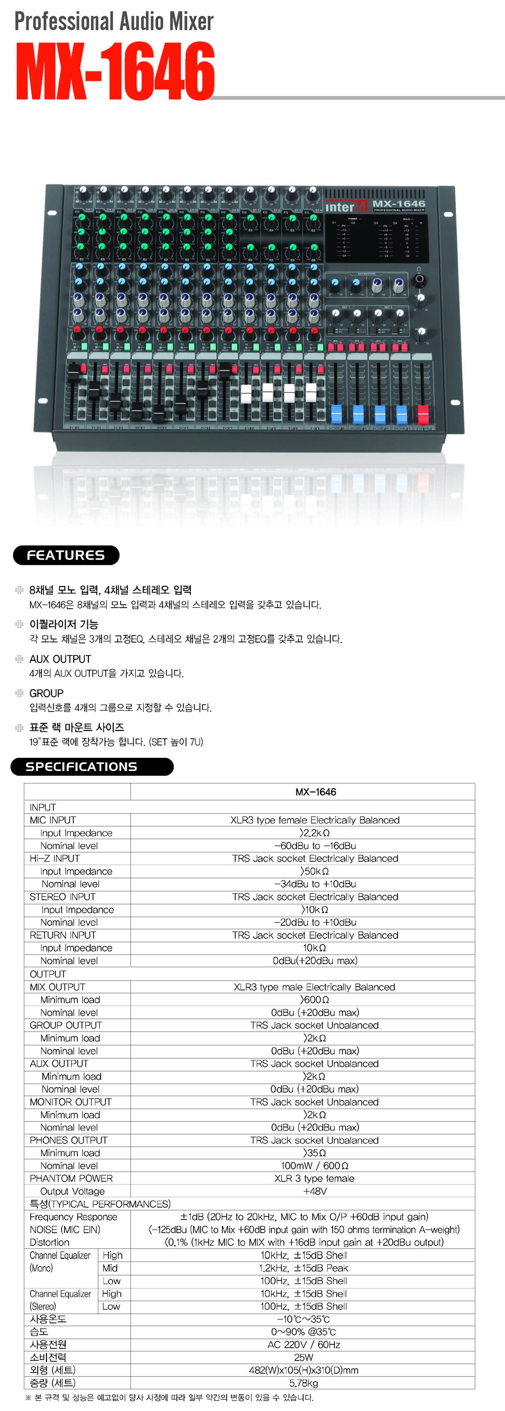 * 제품의 특징 및 사양 ( 인터엠 오디오 믹서 MX-1646 )