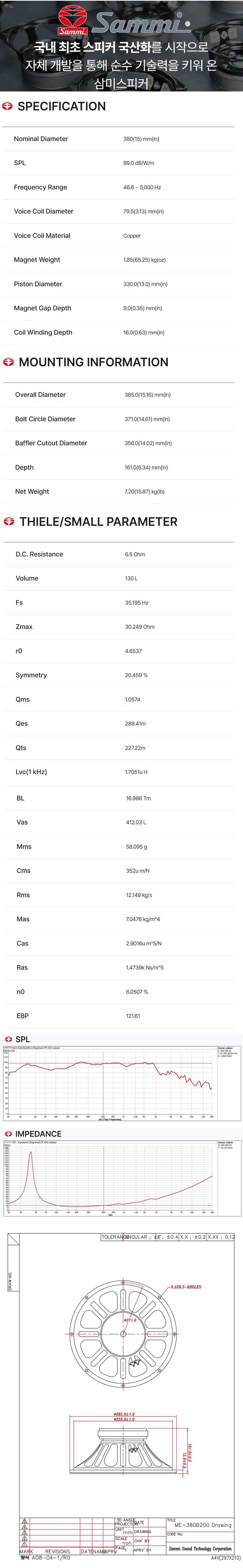 * 제품의 특징 및 사양 ( 삼미스피커 15" 대구경 저음용 뮤직 스피커 ME-380B200 )