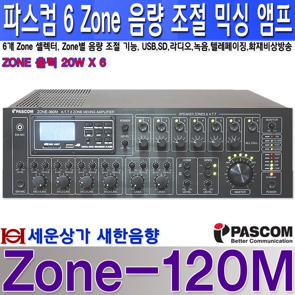 ZONE-120M 파스컴 믹싱 앰프, 6개 구역 개별 음량 조절,USB SD 라디오 녹음, 화재 수신반 연결, ZONE120M 본문