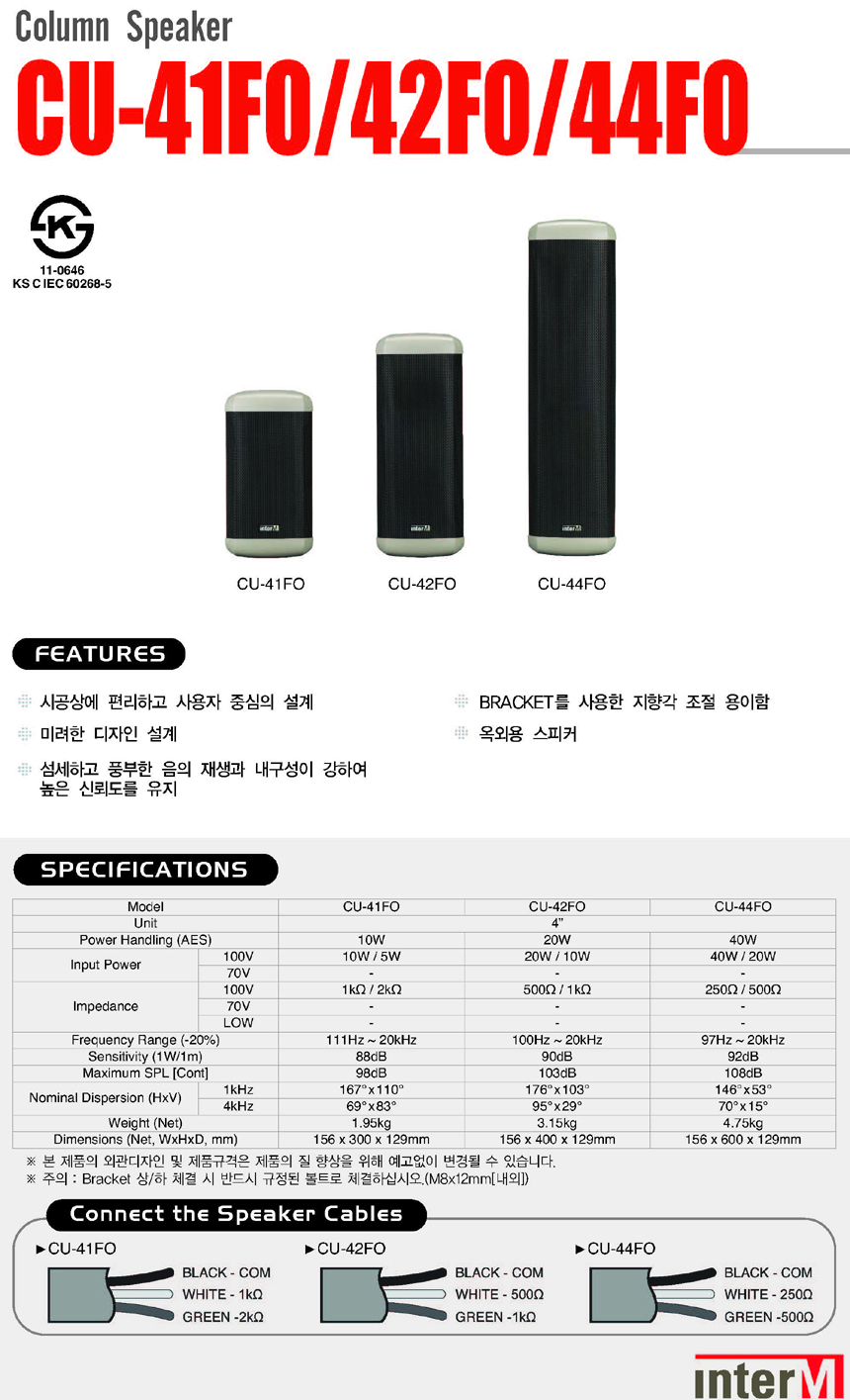 CU-44FO, CU-44FOU 인터엠 40W 방수 컬럼 스피커, KS인증, IP34 등급, 알루미늄 재질, 난연 그릴망 채용, 하이임피던스 / CU44FO 본문